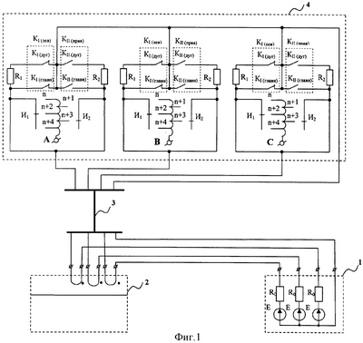Схема содержит трехканальный источник постоянного напряжения (1), трехканальный цифровой осциллограф (2), соединительный четырехпроводный кабель (3), испытуемый силовой трехфазный трансформатор с РПН (4), имеющий в каждой фазе левые и правые плечи контактов контактора.