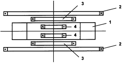 Система регулирования магнитного поля (см. чертеж) содержит кольцевую камеру 1 и пары 2, 3 и 4 электрических контуров (обмоток, катушек и т.п.), соединенных с блоком питания (не показан). Контуры соединены между собой таким образом, что магнитное поле на оси камеры от пары 2 контуров направлено встречно по отношению к магнитному полю пар 3 и 4 контуров (направление токов в контурах показано крестом и точкой).