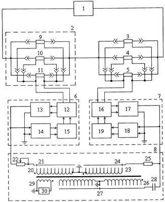 Преобразователь 6 содержит модулятор 12, усилитель переменного напряжения 13, индуктивный делитель напряжения 14 и демодулятор 15. Преобразователь 7 содержит модулятор 16, усилитель переменного напряжения 17, индуктивный делитель напряжения 18 и демодулятор 19.