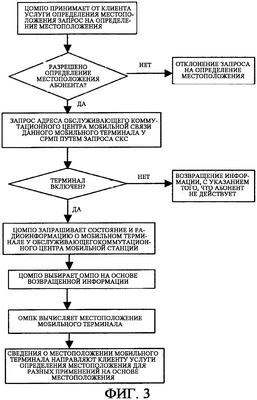 ЦОМПО запоминает информацию о всех ОМПО в возможных зонах роуминга абонента, и поэтому ЦОМПО может выбрать подходящий ОМПО, чтобы выполнить вычисление по определению местоположения для мобильного терминала, исходя из радиоинформации абонента. Радиоинформация включает в себя такие параметры сети как идентификация обслуживающей ячейки, идентификация системы, идентификация сети, идентификация базовой станции, идентификация КЦМС, название сети и пр. ОМПО вычисляет местоположение мобильного терминала на основе информации об идентификации сотовой ячейки и уровне радиосигналов, направляемых со стороны ЦОМПО. При необходимости ОМПО может также получить более точную информацию о местоположении путем осуществления сообщения с данным мобильным терминалом.