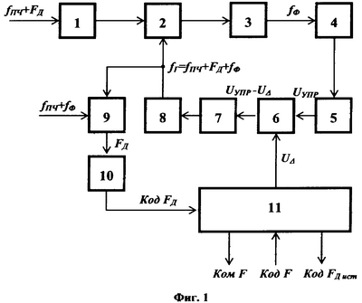 Описанный способ может быть осуществлен с помощью устройства (фиг.1), содержащего последовательно включенные однополосный фильтр ОФ 1, первый смеситель 2, узкополосный фильтр УФ 3, узкополосный частотный дискриминатор ЧД 4, интегратор 5, алгебраический сумматор напряжения 6, управитель 7, настраиваемый напряжением гетеродин 8, второй смеситель 9, счетчик-частотомер 10 и вычислитель 11, причем выход гетеродина 8 соединен также со вторым входом первого смесителя 2, первый выход (U ) вычислителя 11 – со вторым входом алгебраического сумматора напряжения 6, второй вход (Код F) и второй выход (Ком F) – связаны с синхронизатором РЛС, а третий выход (Код FДист) – с управляющей ЭВМ РЛС (на схеме не показаны). Вход ОФ 1 подключен к выходу усилителя промежуточной частоты приемника РЛС, а второй вход второго смесителя 9 – к соответствующему выходу синтезатора частот в РЛС (на схеме не показаны).
