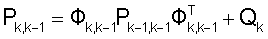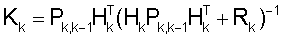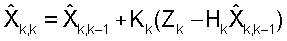 – оценка при измерении; где Хk,k+1, Хk,k – априорная и апостериорная оценки вектора состояния Х на к-том шаге, Pk,k-1, Pk,k – априорная и апостериорная ковариационные матрицы на к-том шаге, Кk – весовая матрица.