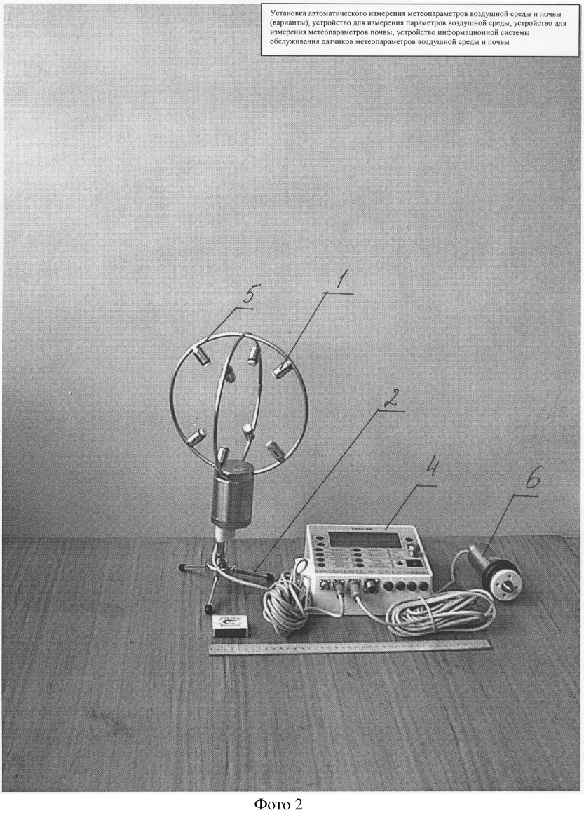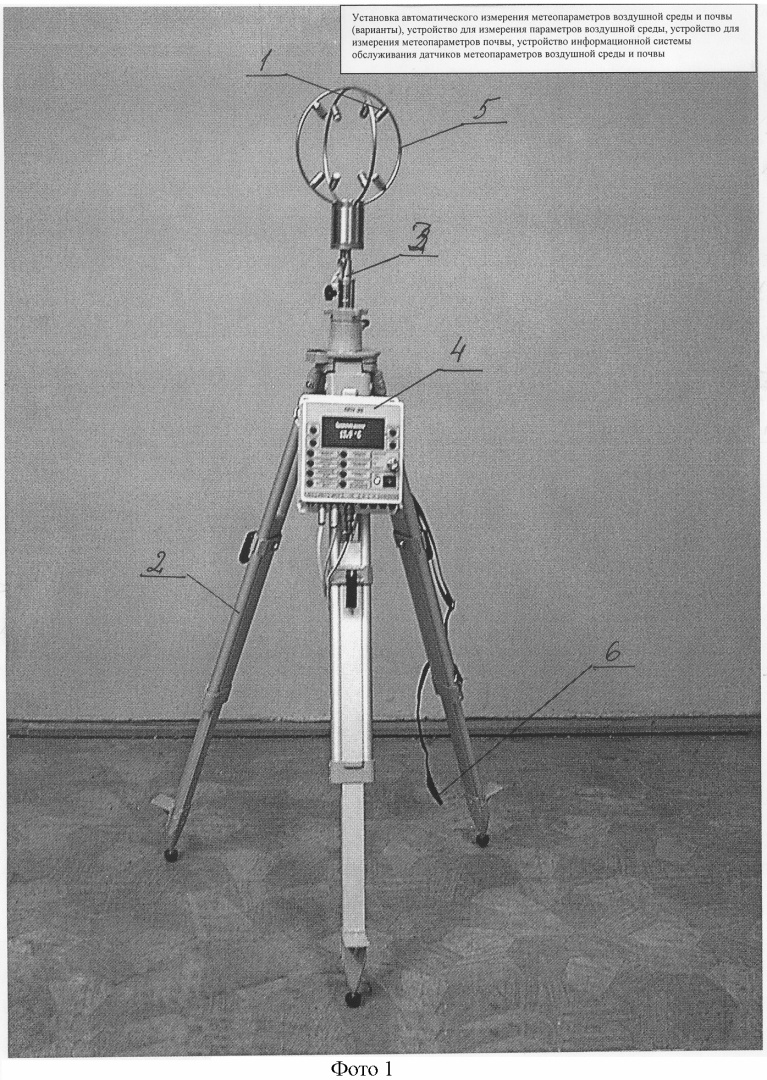 На фиг.1 схематично изображено устройство для измерения метеопараметров воздушной среды, на фиг.2 – сечение А-А, фиг.1, на фиг.3 – устройство для измерения метеопараметров почвы, на фиг.4 – сечение А-А, фиг.3, на фиг.5 – по стрелке Б, фиг.3, на фиг.6 – устройство информационной системы обслуживания датчиков метеопараметров воздушной среды и почвы, на фото 1, 2 изображена установка автоматического измерения метеопараметров воздушной среды и почвы с различным расположением пульта управления.