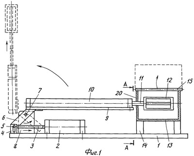 4. Установка по п.1, в которой привод поворота пневмоцилиндра вертикально вверх выполнен в виде горизонтального жестко закрепленного на основании дополнительного пневмоцилиндра, на штоке которого с возможностью перемещения в направляющих основания закреплена серьга, внутри которой установлена ось, жестко закрепленная на одном конце поворотного относительно оси, закрепленной на опоре основания, рычага, другой конец которого жестко закреплен на основном пневмоцилиндре.