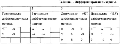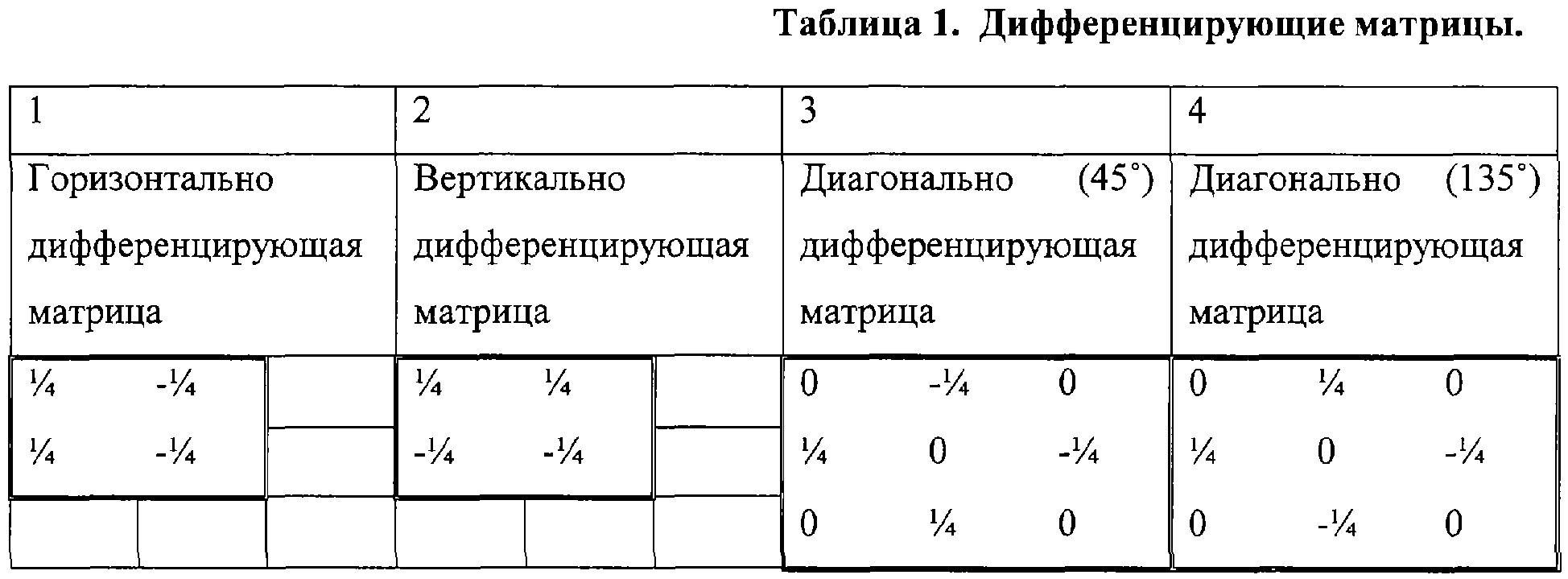 В представленном способе для нахождения абсолютных значений компонент градиента использовались простейшие локальные дифференцирующие фильтры. Осуществлялось дифференцирование исходного изображения приведенными в таблице дифференцирующими матрицами (см. табл.1)