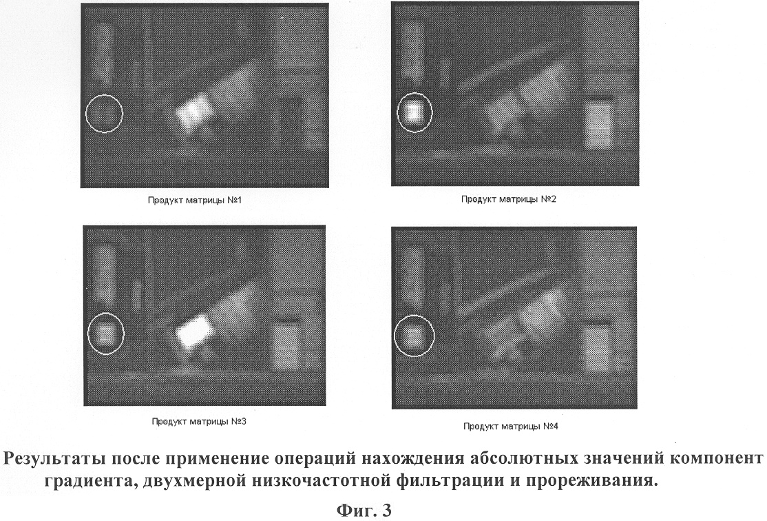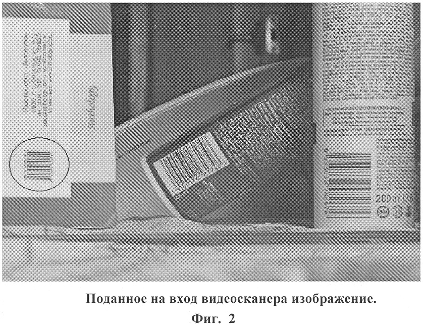На ряде фиг.2, 3, 4 и 5 приведен пример работы способа, на вход которого было подано изображение (см. фиг.2), содержащее линейные штриховые коды, ориентированные под различными углами. На всех изображениях примера кружком обведено место расположения одного и того же штрихового кода. При обработке оцифрованного изображения были найдены абсолютные значения компонент градиента с помощью локальных дифференцирующих фильтров, проведена двухмерная фильтрация и прореживание.