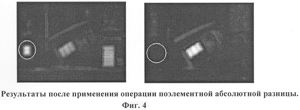 Затем была определена поэлементная абсолютная разница между полученными результатами для двух пар взаимно перпендикулярных направлений компонент. На фиг.4 показаны изображения, полученные после операции нахождения абсолютной поэлементной разницы между изображениями компонент градиента взаимно перпендикулярных направлений (изображение направления №1 вычитается из изображения направления №2, изображение направления №3 вычитается из изображения направления №4).