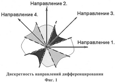 Линейный штриховой код имеет определенное направление штрихов, следовательно, в местах расположения штрихового кода направления градиентов будут одинаковы с некоторым допуском. Для уменьшения объемов вычислений, связанных с оценкой углов поворота градиента, решено было разбить всевозможные направления (360°) на 4 дискретных направления (см. фиг.1), отстоящих друг от друга на 45°. Этот факт объясняет необходимость использования дополнительно пары диагонально дифференцирующих матриц.