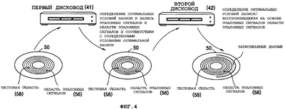 В предположении, что оптический диск 50 никогда не использовался, оптический диск 50 загружается в первый дисковод 41. Дисковод записывает данные в тестовую область 58 на оптическом диске 50, применяя в это время различные наборы условий записи, и затем определяет оптимальные условия записи для оптического диска 60. После этого первый дисковод 41 записывает эталонные данные в область 56 эталонных сигналов на оптическом диске 50 в соответствии с оптимальными условиями записи.
