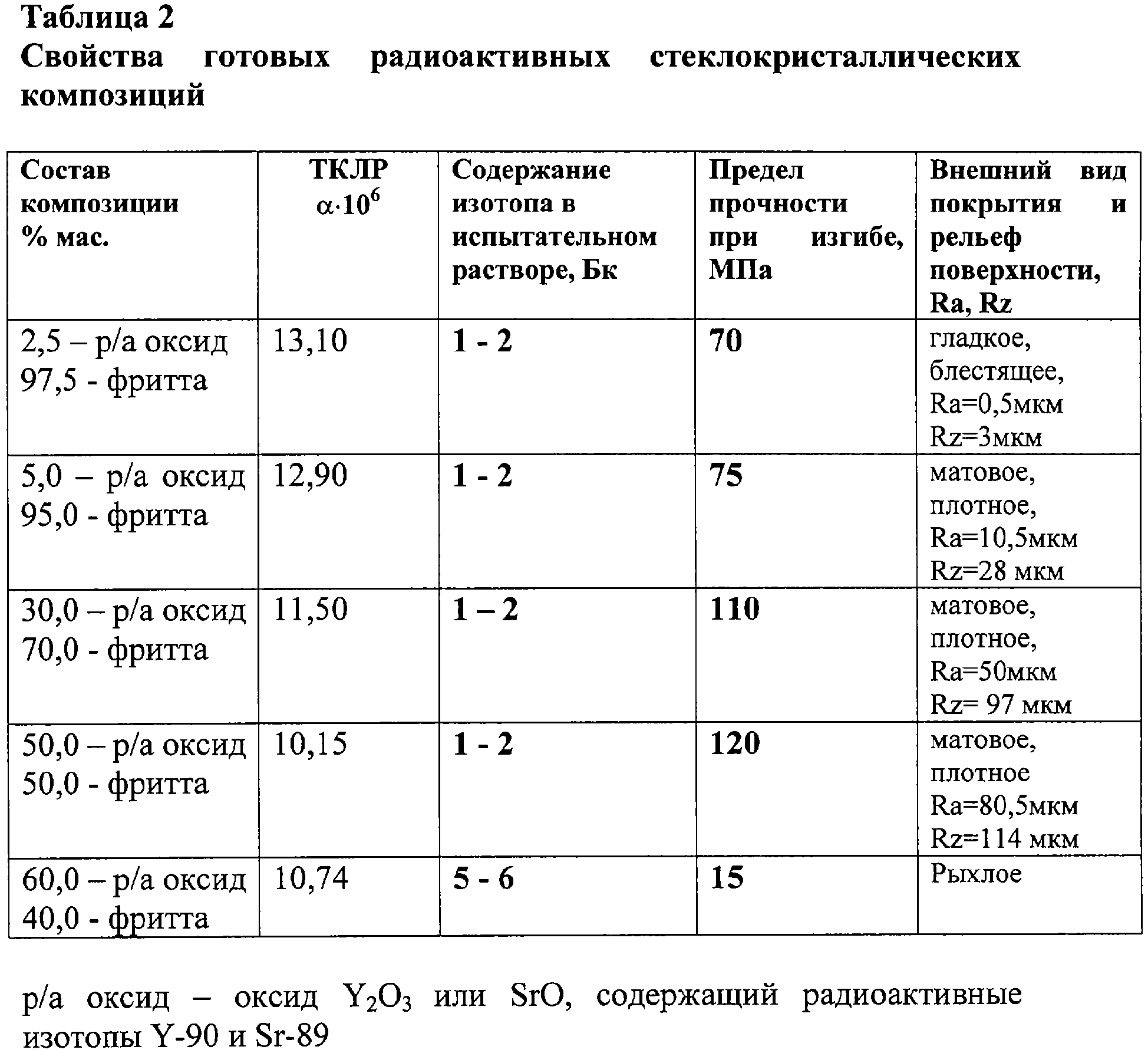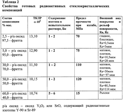 Поставленная задача решена за счет того, что в радиоактивном источнике, также как в прототипе, содержащем радиоактивный изотоп Y2О3 или SrO, согласно изобретению радиоактивный изотоп размещен в объеме твердого носителя и представляет собой монолитную стеклокристаллическую оплавленную композицию или композицию, помещенную на металлический держатель; в качестве твердого носителя используют биоинертное стекло на основе калиевого полевого шпата, при этом композиция содержит: