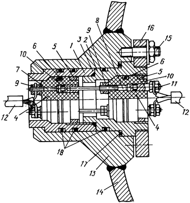 Гайками 9 к гнездам 7 розетки и гайками 11 к штырям 8 вилки крепятся наконечники токоведущих жил кабелей 12. Соединенные между собой собранные корпуса розетки 1 и вилки 2 установлены в полость стакана 13, вваренного в отверстие корпуса 14 барокамеры, и прижаты к нему резьбовыми шпильками с гайками 15 посредством фланца 16 и уплотнены красномедной прокладкой 17, а также резиновыми уплотнительными кольцами 18.