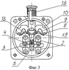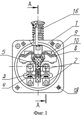 Рычаги 8 и пружины 9 механизма переключения подвижных контактов 3 изогнуты в виде С-образной скобы таким образом, что изгибы рычага 8 и пружины 9 направлены в одну сторону по отношению к неподвижным контактам 2, а в зоне 13 (фиг.3), образованной изгибами рычагов 8 и пружин 9, размещены прилегающие к ним средние части 12 неподвижных контактов 2, проходящая сквозь основание 1 наружная часть 14, выходящая из основания 1 наружу и служащая для крепления токопроводов (не показаны) и внутренняя часть 15, размещенная внутри основания, служащая для крепления неподвижных контактов 2. Приводной элемент поджат возвратной пружиной 16. Основание 1 соединено с крышкой 17 заклепками 18 и содержит нижние ограничители 19 движения, размещенные на основании 1.