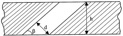 Наклонная щель выполняется таким образом, чтобы электрическое поле анода не проникало в катодно-сеточное пространство. Для этого угол наклона и ширину щели необходимо выбирать из условия d hcos , где d – ширина щели, h – толщина сетки, – угол наклона стенки щели относительно поверхности сетки (см. чертеж). Кроме того, такая конструкция сетки позволяет использовать ее без экрана, что делает конструкцию более простой.