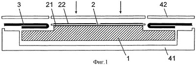 На первой технологической операции на базовом элементе 1 закрепляется изоляционный элемент 2. Изоляционный элемент представляет собой преимущественно подложку с двухсторонним металлизированным покрытием, которая содержит, например, керамическую пластинку с содержанием AlO3 или AlN, металлизированную медью или алюминием. Коэффициент теплового расширения материала базового элемента, например, Мо AlDiC или графит с содержанием алюминия или меди, предпочтительно должен соответствовать такому же коэффициенту материала изоляционного элемента. Изоляционный элемент 2 закреплен с помощью первого металлизированного покрытия 21 непосредственно на базовом элементе, например, с помощью пайки или так называемого низкотемпературного соединения (LTB, Low Temperature Bonding). Второе металлизированное покрытие 22 может располагаться на нескольких, изолированных между собой участках.