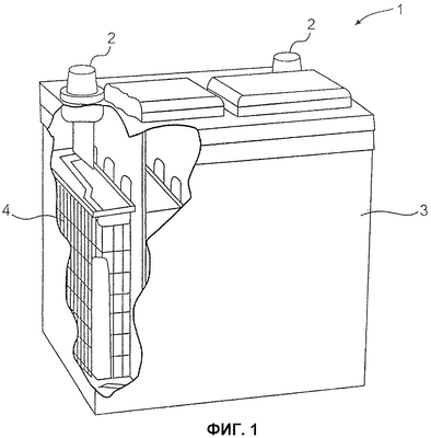Фиг.1 иллюстрирует аккумуляторную батарею 1 в соответствии с показательным примером осуществления настоящего изобретения. Аккумуляторная батарея 1 включает корпус 3 и выводы 2. По крайней мере, один аккумуляторный элемент 4 расположен в корпусе 3. Даже если аккумуляторная батарея 1 может включать только один аккумуляторный элемент, несколько аккумуляторных элементов могут быть соединены последовательно или параллельно для обеспечения общей желаемой емкости аккумуляторной батареи 1. Аккумуляторный элемент 4 может состоять из чередующихся положительных и отрицательных пластин, погруженных в раствор электролита, содержащий, например, серную кислоту.