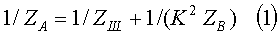 Известно (см., например, книгу “Антенны”. Под ред. Муравьева Ю.К. 4.1. – Л. ВАС, 1963. – с.259-270), что эквивалентная схема такой антенны может быть представлена в виде параллельно включенных сопротивления Zш шунта длиной lш с волновым сопротивлением ш, а также комплексного сопротивления ZB вибратора высотой H, подключенного к выходу антенны с коэффициентом трансформации К2 (фиг.3г). Следовательно, общее входное сопротивление ПША ZA определяется выражением