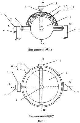 Дуга 5 опорно-поворотного устройства 11 шарнирно соединена с рамой 4 опорно-поворотного устройства. Двигатель вращения блока излучателей 8 размещен в центре дуги опорно-поворотного устройства 5. Рама опорно-поворотного устройства 4 шарнирно соединена с основанием 9, на котором устанавливается антенна. На основании 9 также закреплена линза Люнеберга 1. Двигатель вращения дуги опорно-поворотного устройства 6 закреплен на раме опорно-поворотного устройства 4, а двигатель вращения рамы опорно-поворотного устройства 7 – на основании 9. Излучатели 3 закреплены на сферическом каркасе 2 и образуют блок излучателей 10, при этом апертуры излучателей располагаются на фокальной поверхности линзы Люнеберга 1.