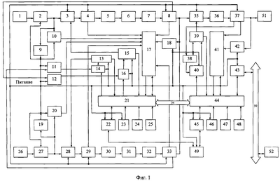 – информационный обмен по интерфейсу 50 со вторым микроконтроллером 44 второго, третьего,… и n-го (на фиг.1 не показаны) двухкаскадных преобразователей напряжения с интеллектуальной защитой от режимов перегрузки и токов коротких замыканий (преобразователей, аналогичных по исполнению и, например, входящих в состав многомодульного агрегата бесперебойного питания) при необходимости обеспечения параллельной работы первого, второго, третьего,… и n-го двухкаскадных преобразователей напряжения на единую динамически изменяющуюся в широком диапазоне мощностей нагрузку.