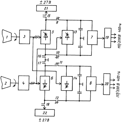 Нерегулируемые магнитоэлектрические генераторы 3 и 4, связанные с валами авиадвигателей 1 и 2, формируют на выходе переменные напряжения нестабильной частоты, пропорциональные оборотам двигателей. Эти напряжения выпрямляются основными управляемыми выпрямителями 5, 6 и поступают на входы регулируемых транзисторных инверторов 7, 8, которые формируют трехфазное напряжение (115/220 В, 400 Гц), передающееся на центральные распределительные устройства переменного тока 20, 21 бортов летательного аппарата.