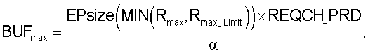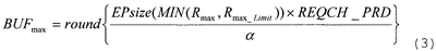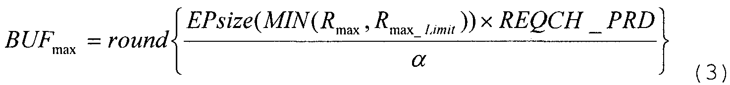 где BUFmax означает максимальное значение ограничения, EPsize означает объем данных, передаваемых для одного пакета, MIN (Rmax, Rmax_ Limit) означает меньшее из Rmax и Rmax_ Limit, REQCH_PRD означает упомянутый период передачи информации о буфере, Rmax означает максимальную доступную скорость передачи данных, Rmax_Limit означает максимальную скорость передачи данных, доступную для мобильной станции, и означает информацию, согласованную между базовой станцией и мобильной станцией.