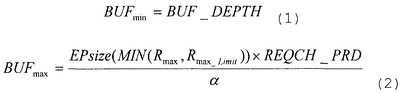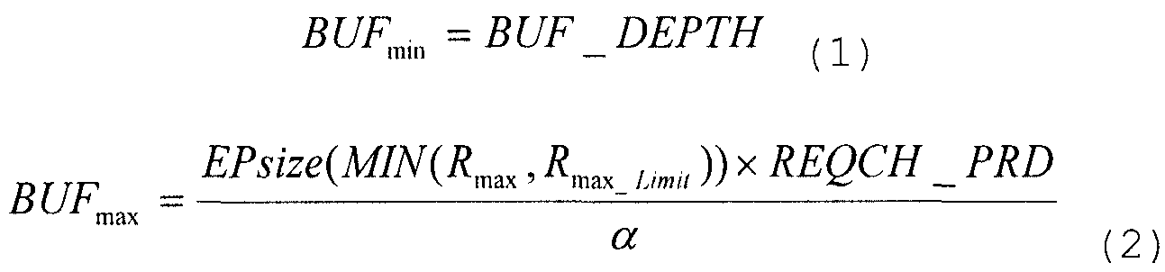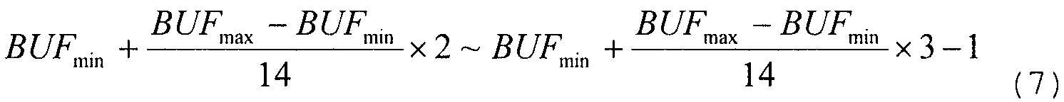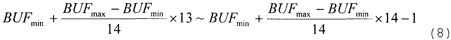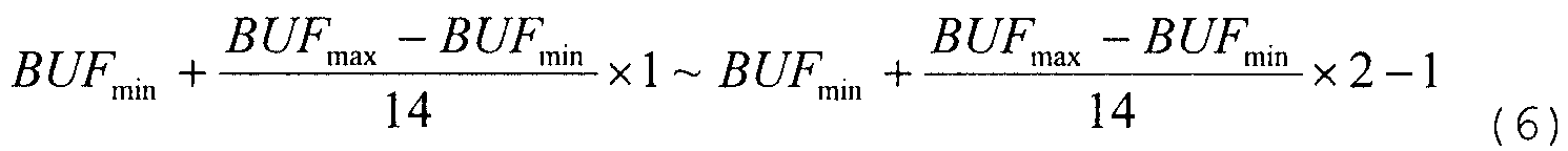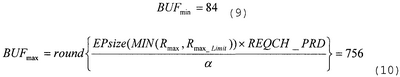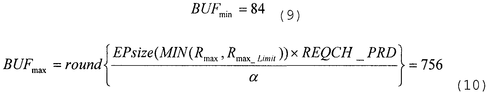 В вышеупомянутом варианте осуществления предполагается, что BUF_DEPTH = 84 битам, Rmax=153,6 Кбит/с, Rmax_Limit = 1,2288 Мбит/с, REQCH_PRD = 80 мс, а =2. В соответствии с уравнением (1) и уравнением (2) BUFmin и BUFmax вычисляются, как проиллюстрировано в уравнении (9) и уравнении (10) соответственно.