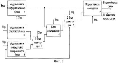 Структурная схема передающего узла предлагаемого устройства приведена на фиг.3. Вход модуля памяти информационного блока является входом устройства, выход модуля памяти информационного блока соединен с первым входом модуля памяти сообщения и с первым входом блока хэширования, второй вход блока хэширования соединен с выходом первого блока коммутации, первый вход которого соединен с выходом модуля памяти стартового блока, а второй вход соединен с выходом модуля памяти предыдущего хэшированного блока, вход второго блока коммутации соединен с выходом блока хэширования, первый выход второго блока коммутации соединен с входом модуля памяти сообщения, а второй выход соединен с входом памяти предыдущего хэшированного блока, выход модуля памяти сообщения соединен с входом прямого канала связи, а второй вход модуля памяти сообщения соединен с выходом обратного канала связи.