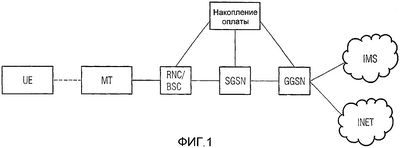 На фиг.1 схематически показан вырез IP-инфраструктуры. Представленным является так называемое “оборудование пользователя” UE, которое подключено к мобильному терминалу МТ. Через этот мобильный терминал МТ оборудование пользователя получает доступ к сети мобильной радиосвязи MF. От сети мобильной радиосвязи MF представлены только существенные в рамках этого изложения элементы сети. В этом примере выполнения представлена сеть мобильной радиосвязи третьего поколения, которая работает по заданиям системы GPRS (GPRS = General Packet Radio System). Представленным является дистанционный сетевой контроллер RNC (Radio Network Controller) или соответственно контроллер базовой станции BSC (Base Station Controller), который образует узел доступа. От RNC подлежащие передаче IP-пакеты направляют к узлу поддержки обслуживания SGSN (Servicing GPRS Support Node). SGSN является управляющим узлом сети, который контролирует мобильность мобильного терминала. Исходя из SGSN, IP-пакеты направляют затем к узлу GGSN (Gateway GPRS Support Node). GGSN является центральной точкой ветвления GPRS-сети, которая в настоящем случае обеспечивает привязку к системе управления пакетов данных IMS (IMS = IP Multimedia Subsystem) или к сети пакетных данных, как, например, Интернет. Если теперь, например, IP-пакеты, которые структурированы согласно заданиям IPv6 и согласно этому содержат заголовок и контейнер данных, передаются от Интернета или IMS к оборудованию пользователя UE, причем, например, чисто пакеты сигнализации должны передаваться бесплатно, то IP-пакеты сначала должны проверяться относительно того, транспортируют ли они чисто данные сигнализации. GGSN проверяет теперь все IP-пакеты, приходящие к нему от Интернета или IMS. Если IP-пакет содержит только данные сигнализации, то GGSN в качестве первого санкционированного элемента сети сети мобильной радиосвязи предпринимает маркировку в поле заголовка. Эта маркировка сигнализирует теперь всем следующим элементам сети, еще подлежащим прохождению IP-пакетом, что этот IP-пакет передается бесплатно. Как SGSN, так и RNC могут служить в качестве пунктов тарификации и и могут выставлять так называемые комплекты данных оплаты. Далее они в состоянии, то есть санкционированы, оценивать маркировку и распознавать IP-пакет, в качестве не подлежащего оплате. Маркировку при этом предпочтительно предпринимают в поле заголовка IP-пакета, элементы поля которого не заняты полностью данными передачи, предусмотренными для передачи соответствующего IP-пакета. При этом IP-пакет структурирован согласно заданиям IPv6. Маркировка может, например, вводиться в поле “идентификатора потока” (“Flow Label”). Далее, возможно производить маркировку в поле “идентификатор интерфейса” (“Interface-ID”). Последнее часто имеет такие большие размеры, что не все элементы поля требуются для приема информации идентификатора интерфейса (Interface-ID). За счет этого неиспользованные биты или, соответственно, байты могут использоваться согласно изобретению для введения маркировки. Кроме того, является возможным определять дополнительный IРv6-заголовок, так называемый “заголовок расширения” (“extension header”) и в нем производить маркировку. Если хотят маркировать только пакеты сигнализации, то они должны быть сначала распознаны как таковые. Для этой цели можно, например, предпринимать так называемый поиск по шаблону (Pattern-Matching) заголовка IP-пакета с масками известных тип