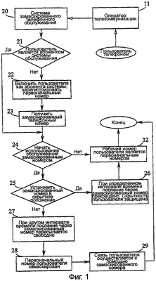 На фиг.1 представлена технологическая схема процесса осуществления замаскированного телефонного обслуживания согласно настоящему изобретению с целью иллюстрации метода маскирования первоначального телефонного номера и защиты скрытного положения пользователя.