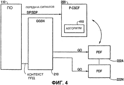 Как показано на фиг. 4, алгоритм 410 может быть воплощен в качестве части P-CSCF 220 для того, чтобы убедиться в том, что P-CSCF 220 будет использовать один и тот же PDF для всех операций заданного ПО 110. Таким образом, GGSN 210 будет всегда получать только один и тот же адрес PDF для всех операций. Как результат, даже если GGSN 210 и другие объекты ПИМ основываются на Спецификации 3GPP, Выпуск 5, GGSN 210 будет всегда работать в соответствии с другими объектами ПИМ, такими как ПО 110 и P-CSCF 220, на основе Спецификации 3GPP, Выпуск 6. Кроме того, работа GGSN 210 и PDF намного проще, когда нет отношения один-ко-множеству между объектами ПИМ.