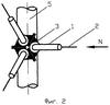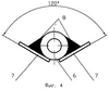 На фиг.4 показан вид по потоку патрубка 6 с плоскими контактами 7, по два контакта на каждый патрубок 6. Контакты 7 представляют собой, например, плоские металлические пластины толщиной бк и прямоугольной формы в ортогональной проекции (вид сверху). Контакты 7 прикреплены к патрубку 6 меньшей стороной по образующей патрубка 6 и по касательной к его поверхности. Полость между контактом и поверхностью патрубка 6 заполнена, например, сварным швом 8. Угол между плоскостями контактов состовляет 120°.