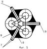 На фиг.5 изображен равносторонний треугольник, по вершинам которого расположены центры сечения патрубков 6 плоскостью, перпендикулярной направлению потока. Длина стороны этого данного треугольника обозначается “а” и составляет: а=Dп+2бк,