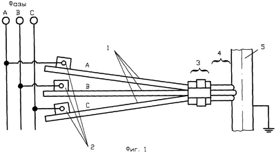 На фиг.1 и фиг.2 изображен трехфазный трубчатый проточный электроподогреватель газа с токоведущими трубками 1, образующими слабо расходящийся трубный пучек, токоподводы 2 на токоведущих трубках 1, нулевую шину 3 и трубки 4, подводящие газ от нулевой шины 3 к сборному коллектору 5. Токоведущие трубки 1 отмечены также символами А, В, и С – соответственно фазам источника электропитания, к которому подключены эти токоведущие трубки 1 через контакты 2.