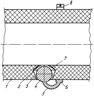 Чтобы обеспечить расход через водовыпуск при очень низком давлении Н, когда гибкая связь 5 поднимает шар 4 до касания конуса 2, на его стенке предусмотрены канавки 7. Для монтажа водовыпуска шар 4 сжимается и устанавливается в гнездо, где он фиксируется между конусами 2, 3, а фиксирующий элемент 6 охватывает снаружи стенку трубопровода и стопорится защелкой 8.