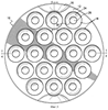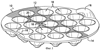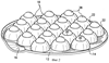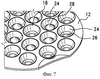 Согласно показанному на фиг.3 виду сверху на плоскости гнезда формы 10 расположены в три концентрических ряда вокруг центрального гнезда со смещением друг относительно друга, что обеспечивает максимальное использование площади поддона. Относительно небольшой размер гнезд 18 (открывающееся вверх входное отверстие каждого гнезда составляет примерно 35 мм в диаметре) позволяет, в частности, использовать эту форму 10 для формования кондитерских изделий, таких как шоколадные конфеты. Само собой разумеется, что это только один пример того большого количества пищевых продуктов, которые можно формовать или отливать с помощью заявленной формы, при этом фактический размер и конфигурация гнезда или гнезд формы будет зависеть от требуемой конфигурации готового продукта.