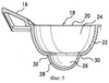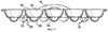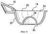 Из показанного на фиг.2 вида формы снизу в аксонометрии и поперечных разрезов на фиг.4 и 5 очевидно, что все гнезда 18 в данном варианте формы имеют одну и ту же конфигурацию. Каждое гнездо 18 имеет (форма находится в положении заливки подлежащего формованию продукта) открытый, направленный вверх приемный конец, или горловину, 20, ограниченный первичной периферийной стенкой 22, предпочтительно сужающейся книзу или внутрь в виде конуса или дуги, что облегчает извлечение готового формованного пищевого продукта. Указанная стенка 22 образует верхнюю секцию гнезда, которая ограничивает верхнюю первичную формующую камеру 24, сообщающуюся непосредственно с нижележащей, меньшей по размеру, вторичной камерой 26 в нижней секции гнезда, ограниченной вторичной периферийной стенкой 28, и образует вкупе с ней сплошной максимальный формующий объем или конфигурацию. Стенка 28 и ограничиваемая ею нижняя секция выполнены в предпочтительном варианте в виде полусфер с закрытым дном и периферийной кромкой, представляющей собой единое целое с нижней кромкой периферийной стенки 22 первичной формующей камеры 24 по всей периферийной линии изгиба 30, образующейся за счет некоторого сужения толщины целостных стенок 22 и 28. Благодаря этому обеспечивается переворачивающее движение между верхней и нижней секциями гнезда, ограниченными первичной и вторичной стенками. Из чертежей очевидно (хотя изобретение не ограничивается только представленным на чертежах вариантом), что нижние секция и камера гнезда в предпочтительном варианте расположены соосно под первичной формующей камерой и составляют примерно половину ее ширины в поперечнике. Высота нижней вторичной камеры составляет примерно половину высоты верхней первичной формующей камеры.