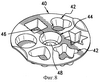 На фиг.8, 9 и 10 показана форма (противень) другой конфигурации 40. Эта форма (противень) 40, также представляющая собой единую конструкцию из допущенного к применению в пищевой промышленности соответствующего высокоэластичного материала, например силикона, включает меньшее количество более крупных по размеру гнезд 42 различных фиксированных конфигураций в сочетании с, по меньшей мере, одним гнездом 44 регулируемой конфигурации. На фиг.8 и 9 показаны некоторые из множества конфигураций формующих камер, при этом каждая из них обычно имеет несколько сужающуюся книзу на конус конфигурацию для облегчения извлечения формованного продукта из формы.