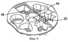 Из показанного на фиг.10 поперечного разреза формы очевидно, что гнездо 44 включает, как и первые описанные гнезда, верхнюю первичную камеру 46 большего размера и сообщающуюся с ней вторичную камеру 48 меньшего размера. Периферийная стенка 50 вторичной камеры определяет полусферическую конфигурацию в виде перевернутого купола, как это описано в первом варианте изобретения, или любую другую легко изменяющуюся конфигурацию, например в форме перевернутой усеченной пирамиды, куба и т.п., первично определяемую формой верхнего углубления в формованном пищевом продукте. Высокоэластичная стенка 50 вторичной камеры и стенка 52 первичной камеры имеют гибкое соединение 54, которое позволяет при слабом сжатии нижней камеры вводить ее в верхнюю первичную камеру, как показано тонкими линиями на фиг.10.