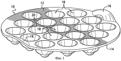 Как показано на чертежах, в частности на фиг.1-3, предпочтительный вариант изобретения представляет собой цельную (неразъемную) форму 10, состоящую из плоского поддона 12 с закругленными, жестко отбортованными краями 14 и диаметрально расположенными на них дугообразными ручками или аналогичными приспособлениями 16, с помощью которых можно открывать формующие гнезда или отделения 18, составляющие единое целое с корпусом 12.