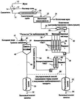 В качестве альтернативы концентрированный белковый раствор в трубопроводе 58 может поступать по трубопроводу 66 для смешивания с белковой мицеллярной массой перед тем, как смесь высушивают в распылительной сушке 50.