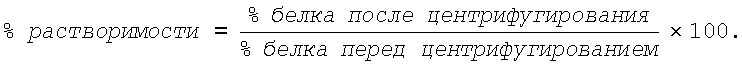 В чашу миксера вносили сухой изолят белка канолы, полученный распылительной сушкой, и воду. Белок диспергировали в воде путем перемешивания раствора вручную ложкой до полного увлажнения всего белка. Полученную жидкую смесь помещали в шприц на 5 см3, а затем экструдировали в воду с температурой от 95°С до 99°С. На поверхности воды образовывались длинные волокна, похожие на спагетти. Длинные белковые волокна переворачивали вручную для равномерной тепловой обработки их с обеих сторон продукта. Волокна вынимали из воды и удаляли избыток воды с помощью адсорбирующего влагу полотенца. Изоляты белка канолы образовывали длинные и эластичные волокна золотисто-желтого цвета. Пример 13 Настоящий пример показывает растворимость изолята белка канолы. 10 г сухого изолята белка канолы BW-AL011-I21-01A, полученного, как описано в примере 1, объединяли с 400 мл дистиллированной воды в стакане на 600 мл для приготовления 2,5 мас.% белкового раствора. Белковый раствор перемешивали гомогенизацией в течение 2 минут при 4500 об./мин до получения однородной суспензии. Определяли рН белкового раствора и раствор разделяли на одинаковые по объему части для доведения рН, рН одних из которых устанавливали в щелочной, а других – в кислой области рН. рН белкового раствора доводили до рН 4,0; 4,5; 5,0; 5,5; 6,0; 6,5; 7,0; 7,5 и 8,0 с помощью 0,1 М раствора NaOH или 5% HCl. Отбирали небольшую пробу каждого из растворов с доведенным рН для определения содержания белка. 30 мл раствора с установленным рН помещали в центрифужную пробирку на 45 мл и центрифугировали 10 минут при 10000 об./мин. По окончании центрифугирования определяли концентрацию белка в надсадочном слое для каждого из образцов с установленным рН. % растворимости белка определяли исходя из следующей зависимости: Полученные результаты приводятся в таблице XV.