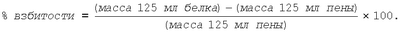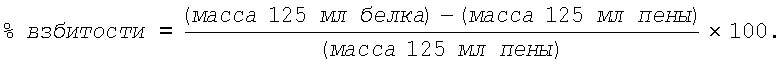Как видно из данных таблицы XV, изолят белка канолы был хорошо растворим при всех проверенных значениях рН, но имел наиболее низкую растворимость при нейтральном рН (от 6,5 до 7,0). Пример 14 Настоящий пример иллюстрирует пенообразующие свойства изолята белка канолы. 3,75 г изолята белка канолы BW-AL011-I21-01A, приготовленного, как описано в примере 1, помещали в стакан на 150 мл. К белку добавляли 60 мл 0,075 М раствора NaCl с получением сначала пастообразной смеси при растворении белка в нескольких мл жидкости. Смесь перемешивали с помощью магнитной мешалки в течение 10 минут. pH раствора устанавливали на уровне рН 7,00 добавлением 0,1 М раствора NaOH, и раствор вновь перемешивали в течение следующих 10 минут. Затем повторно устанавливали рН на уровне 7,00, и объем жидкости доводили до 75 мл добавлением требуемого количества 0,075 М раствора NaCl для получения 5% мас./об. белкового раствора. 75 мл полученного раствора переносили в чашу миксера фирмы Хобарт и замеряли общую массу раствора, чаши миксера и взбивалки. Белковый раствор взбивали на скорости 3 в течение 5 минут. Достаточное количество пены осторожно отбирали из чаши для заполнения с помощью резинового шпателя 2 мерных стаканчиков, тарированных на 125 мл. Избыток пены удаляли, используя для этого плоский край большого ножа, таким образом, чтобы сравнять верхнюю поверхность пены вровень с верхней частью мерного стаканчика, и замеряли массу пены. Затем пену осторожно возвращали в чашу миксера и взбивали в течение еще 5 минут. Эту процедуру повторяли. Пену осторожно возвращали в чашу миксера и вновь взбивали в течение 5 минут, т.е. суммарно в течение 15 минут. Процедуру вновь повторяли. Взбитость рассчитывали по следующему уравнению: Проверяли также стабильность пены. Белковый раствор готовили по той же методике, что и для измерений % взбитости, за исключением того, что белковый раствор взбивали в течение 15 минут на скорости 3. Используя резиновый шпатель, пену осторожно переносили в воронку на 1 л с длинным отводящим концом, опущенным в мерный цилиндр на 250 мл. Перед перенесением пены в верхнее отверстие воронки помещали небольшое количество кварцевой ваты для предупреждения отекания пены, позволяя при этом жидкости стекать. Измеряли объем жидкости, собравшейся в мерном цилиндре спустя 5, 10 и 15 минут. Объем, удерживаемый ватой, прибавляли к конечному объему. Эксперименты повторяли для проведения сравнения с яичным белком, изолятом белков молочной сыворотки (от NZHP) и изолятом соевого белка (от ADM). Полученные результаты приводятся в таблицах XVI, XVII, XVIII и XIX.