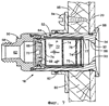 Как показано на фиг.7, выпускной элемент 18 установлен в отверстии в поверхности зеркала 20 и включает в качестве его основных компонентов деталь 50 водопроводной арматуры, патрон 52 для образования ламинарного потока и фронтальное (торцевое) сопло 54. Деталь 50 водопроводной арматуры предпочтительно изготовлена из латуни и имеет по существу трубчатую форму с задней соединительной частью 58, к которой может быть подсоединена магистраль для подачи воды. В альтернативном варианте часть 58, предназначенная для подсоединения к питающей магистрали, может проходить поперек к продольной оси детали 50 водопроводной арматуры. Задний конец цилиндрического патрона 52, предназначенного для образования ламинарного потока, входит в открытый конец цилиндрической детали 50 водопроводной арматуры, и уплотнительное кольцо образует водонепроницаемое уплотнение между ними. Открытый конец цилиндрической детали 50 водопроводной арматуры ввинчен в отверстие в задней части фронтального сопла 54, и другое уплотнительное кольцо образует водонепроницаемое уплотнение между этими элементами.