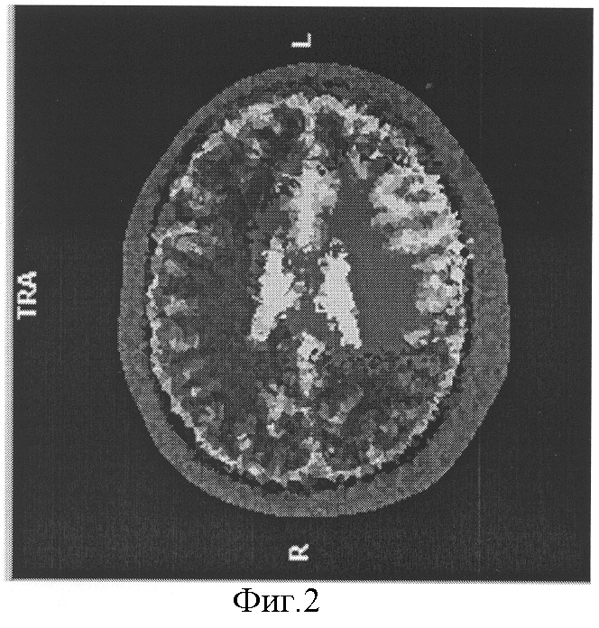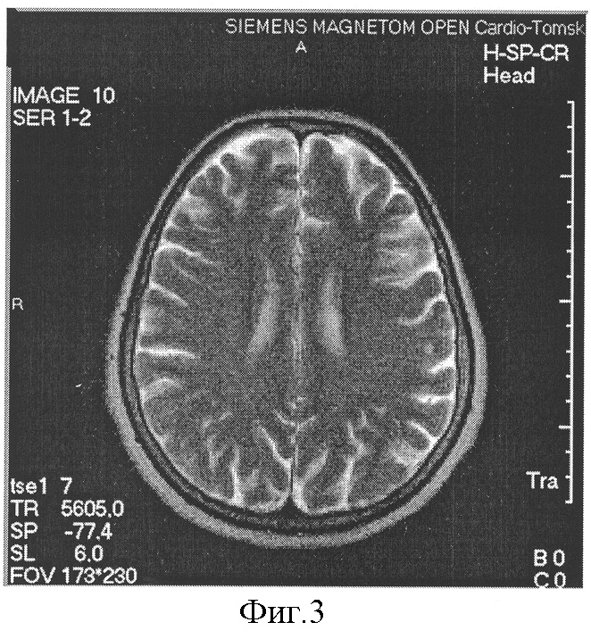 На фиг.3 изображен очаг нарушения перфузии головного мозга (ОНМК) по МРТ исследования.