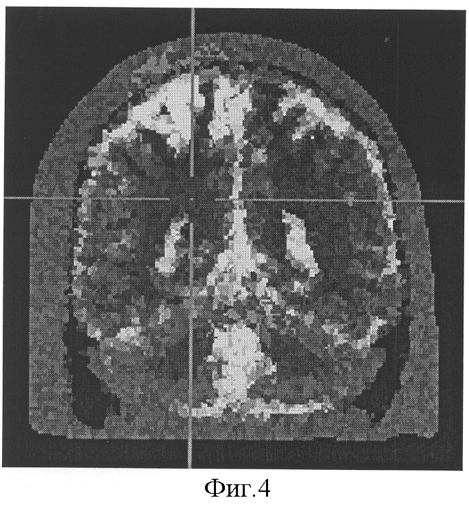 Диагноз был подтвержден ангиографически и эхоскопически. При проведение гипоксической пробы была выявлена зона усиленной гидратации (сниженной проводимости ткани) на основании данных электроимпедансной томографии, в правой теменной доли. Фиг.4.