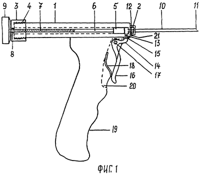 Сущность изобретения и конкретный пример исполнения устройства поясняется чертежами. На фиг.1 изображено устройство, вид сбоку. На фиг.2 – то же, вид снизу. На фиг.3 – то же, вид спереди. На фиг.1-3 обозначены: 1 – цилиндр; 2 – наконечник с наружной резьбой под резьбу в канюле иглы; 3 – крышка цилиндра с внутренней резьбой под резьбу на внешней поверхности конца цилиндра; 4 – резьба на внешней поверхности конца цилиндра; 5 – поршень; 6 – шток; 7 – резьба на внешней поверхности конца штока; 8 – резьба на внутренней поверхности отверстия в крышке под внешнюю резьбу штока; 9 – головка штока; 10 – трубка иглы; 11 – просвет иглы на рабочем конце; 12 – канюля иглы с внутренней резьбой; 13 – канал в боковой стенке цилиндра; 14 – прижимной конец крючка; 15 – упругоэластичная герметизирующая прокладка на прижимном конце крючка; 16 – отпускной конец крючка; 17 – ось крючка; 18 – пластинчатая пружина крючка; 19 – ручка; 20 – продольный паз в ручке; 21 – прокладка.