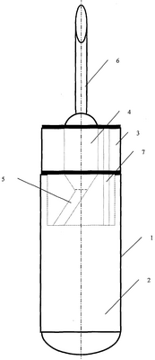 Прибор состоит из двух основных частей: коннектора 3 и трубчатого корпуса 1 с заглушенным концом. Верхняя часть коннектора предназначена для жесткой фиксации иглы (например, иглы Сайковича), а нижняя для соединения с трубчатым корпусом. Направление канала, по которому кровь поступает в полость 2 трубчатого корпуса 1, отклонено от оси прибора на 22°, что позволяет крови в любом случае стекать по стенке полости трубчатого корпуса без дополнительных манипуляций со стороны ветеринарного специалиста. Плотное соединение коннектора с корпусом и иглой позволяет визуально ориентироваться с углом ввода последней в вену животного. Кровь животного, поступая в полость 2 корпуса 1, вытесняет через дренажный канал 7 воздух в атмосферу, а сама, стекая по внутренней стеки корпуса, заполняет полость 2.