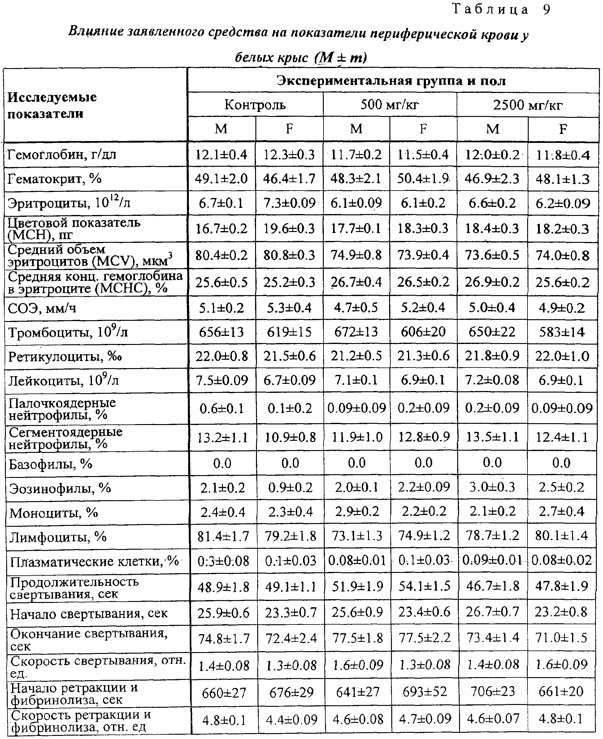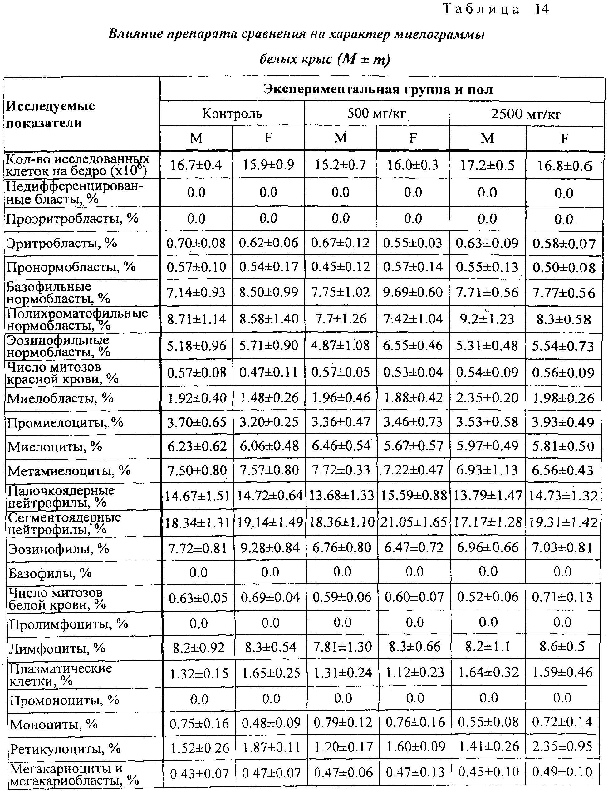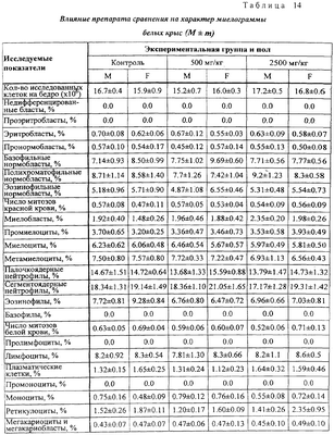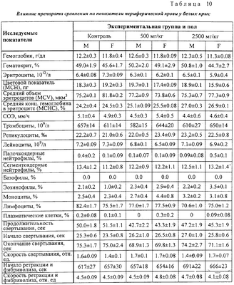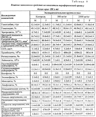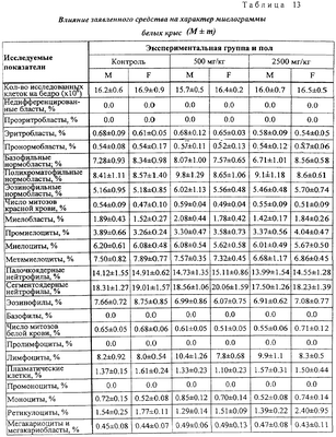 Анализ полученных результатов показывает отсутствие отличия опытных групп от контрольных по величине ЧСС. На 30-й день значение критерия межгруппового различия – величина F0 – было равно 0.71 при критическом значении F0,95;10,90=1,99. Влияние на показатели периферической крови Гематологические и биохимические исследования крови проводились в конце исследования. Кровь получали после одномоментного гильотинирования. Полученные данные представлены в таблицах 9 и 10. Статистический анализ полученных данных не выявляет значимых отличий между всеми экспериментальными группами ни по одному из показателей (для всех показателей критерий неоднородности групп оказался ниже критического значения). Данные, показывающие влияние на основные биохимические показатели периферической крови белых крыс представлены в таблицах 11 и 12. Как следует из представленных в таблицах 11 и 12 данных, при воздействии на животных заявленного средства и препарата сравнения различий по основным биохимическим показателям не выявлено. Влияние на характер миелограммы Одновременно с отбором крови для гематологических исследований у забитых животных извлекались бедренная кость для исследования миелограммы. Результаты исследования представлены в таблицах 13 и 14. Как видно из результатов, представленных в таблицах 13 и 14, различий между заявленным средством и препаратом сравнения по влиянию на характер миелограммы белых крыс не обнаружено. Терапевтический эффект заявленного средства изучен также на 10 пациентах с верифицированным диагнозом: дерматомикоз стоп. Пациенты были разделены на 2 равные группы: 1 группа получала лечение кремом “Ламизил”; 2 группа получала лечение заявленным средством. Всем пациентам наносили тонким слоем на кожу стоп и втирали 2 раза в сутки ежедневно на подсушенные пораженные участки изучаемые препараты. Пациенты в 1 группе отметили прекращение зуда на пораженных через 7 часов, во 2 группе – через 5 часов от начала лечения. В этих группах выраженность клинических проявлений уменьшилась уже через 1-2 суток от начала лечения. Полное излечение наступило в обеих группах через 8 дней. Результаты исследования показали, что заявленное средство обладает выраженным противогрибковым действием, не уступая препарату сравнения. При этом отмечена хорошая впитываемость средства благодаря его высокой тропности к коже. Таким образом, предложенное противогрибковое средство обладает выраженным специфическим действием, длительным сроком хранения, высокой тропностью к коже, низкой стоимостью, что позволяет широко использовать его медицинской практике.