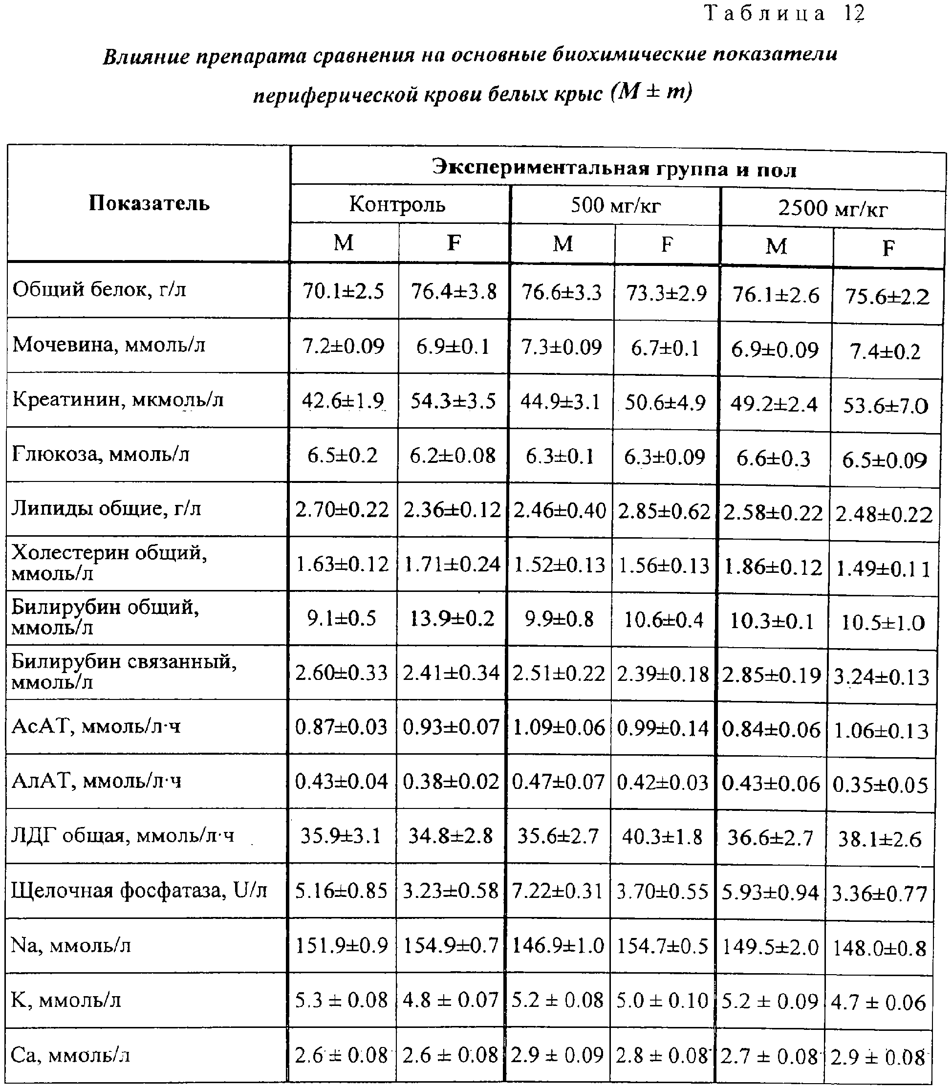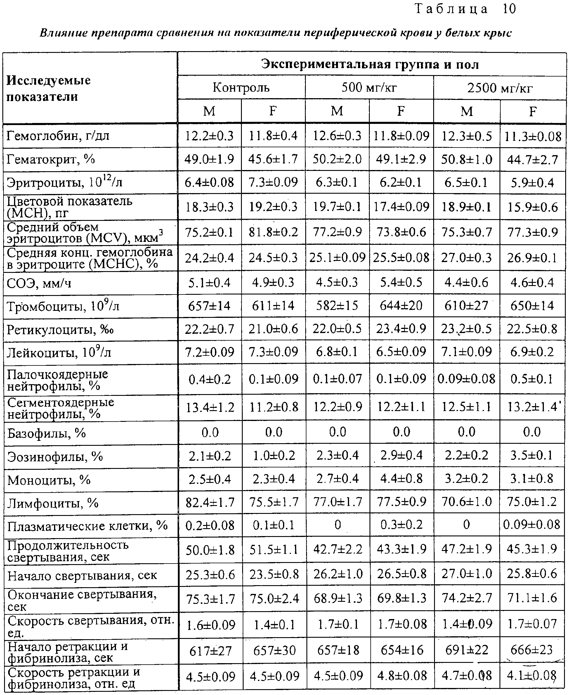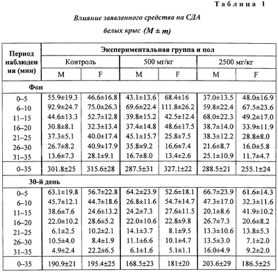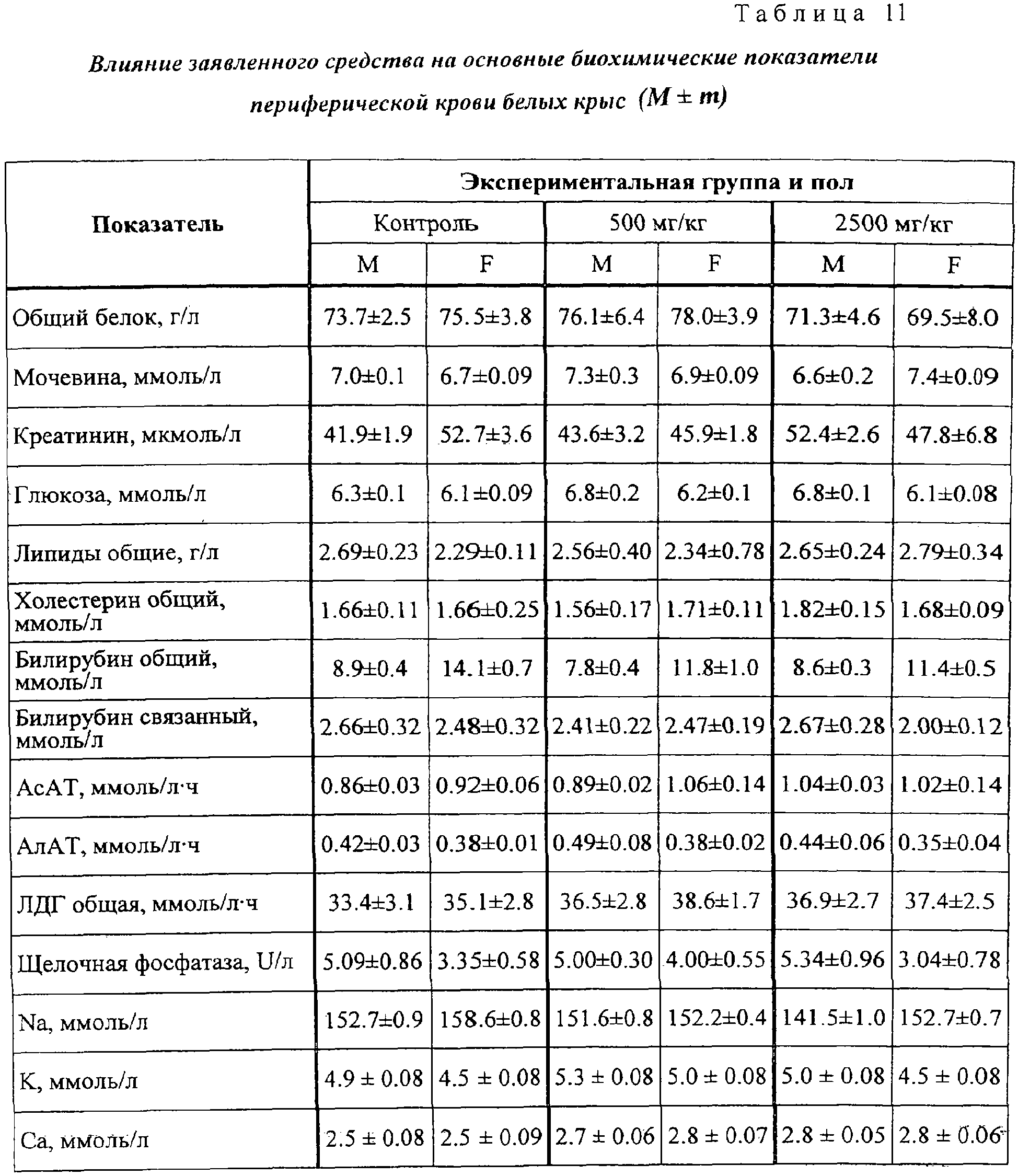 Анализ полученных результатов показывает отсутствие отличия опытных групп от контрольных по величине ЧСС. На 30-й день значение критерия межгруппового различия – величина F0 – было равно 0.71 при критическом значении F0,95;10,90=1,99. Влияние на показатели периферической крови Гематологические и биохимические исследования крови проводились в конце исследования. Кровь получали после одномоментного гильотинирования. Полученные данные представлены в таблицах 9 и 10. Статистический анализ полученных данных не выявляет значимых отличий между всеми экспериментальными группами ни по одному из показателей (для всех показателей критерий неоднородности групп оказался ниже критического значения). Данные, показывающие влияние на основные биохимические показатели периферической крови белых крыс представлены в таблицах 11 и 12. Как следует из представленных в таблицах 11 и 12 данных, при воздействии на животных заявленного средства и препарата сравнения различий по основным биохимическим показателям не выявлено. Влияние на характер миелограммы Одновременно с отбором крови для гематологических исследований у забитых животных извлекались бедренная кость для исследования миелограммы. Результаты исследования представлены в таблицах 13 и 14. Как видно из результатов, представленных в таблицах 13 и 14, различий между заявленным средством и препаратом сравнения по влиянию на характер миелограммы белых крыс не обнаружено. Терапевтический эффект заявленного средства изучен также на 10 пациентах с верифицированным диагнозом: дерматомикоз стоп. Пациенты были разделены на 2 равные группы: 1 группа получала лечение кремом “Ламизил”; 2 группа получала лечение заявленным средством. Всем пациентам наносили тонким слоем на кожу стоп и втирали 2 раза в сутки ежедневно на подсушенные пораженные участки изучаемые препараты. Пациенты в 1 группе отметили прекращение зуда на пораженных через 7 часов, во 2 группе – через 5 часов от начала лечения. В этих группах выраженность клинических проявлений уменьшилась уже через 1-2 суток от начала лечения. Полное излечение наступило в обеих группах через 8 дней. Результаты исследования показали, что заявленное средство обладает выраженным противогрибковым действием, не уступая препарату сравнения. При этом отмечена хорошая впитываемость средства благодаря его высокой тропности к коже. Таким образом, предложенное противогрибковое средство обладает выраженным специфическим действием, длительным сроком хранения, высокой тропностью к коже, низкой стоимостью, что позволяет широко использовать его медицинской практике.