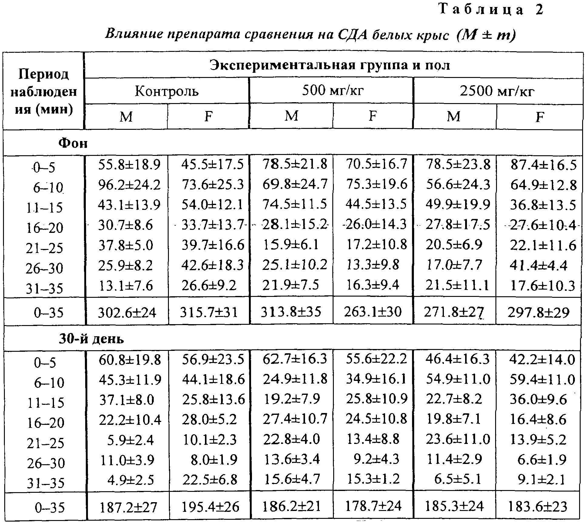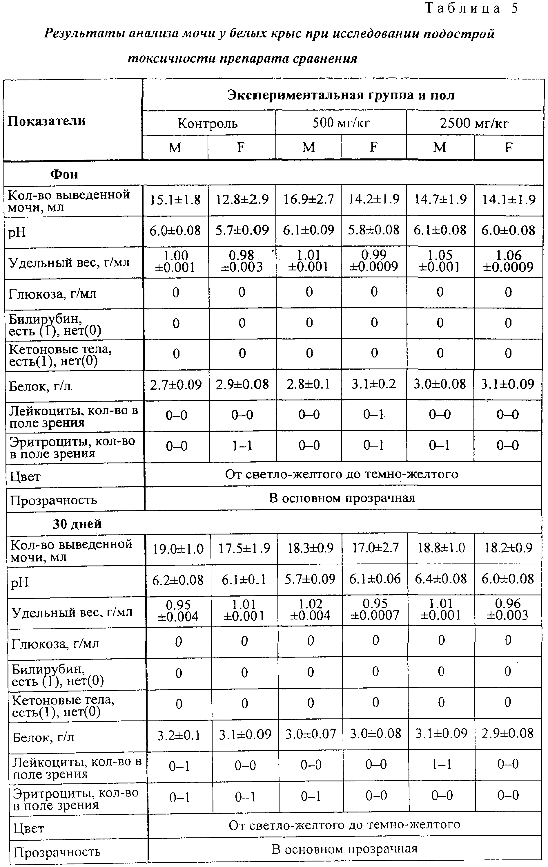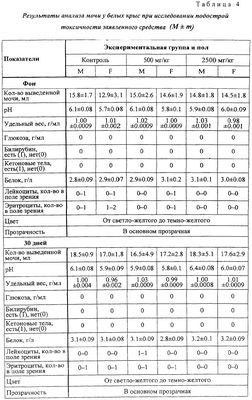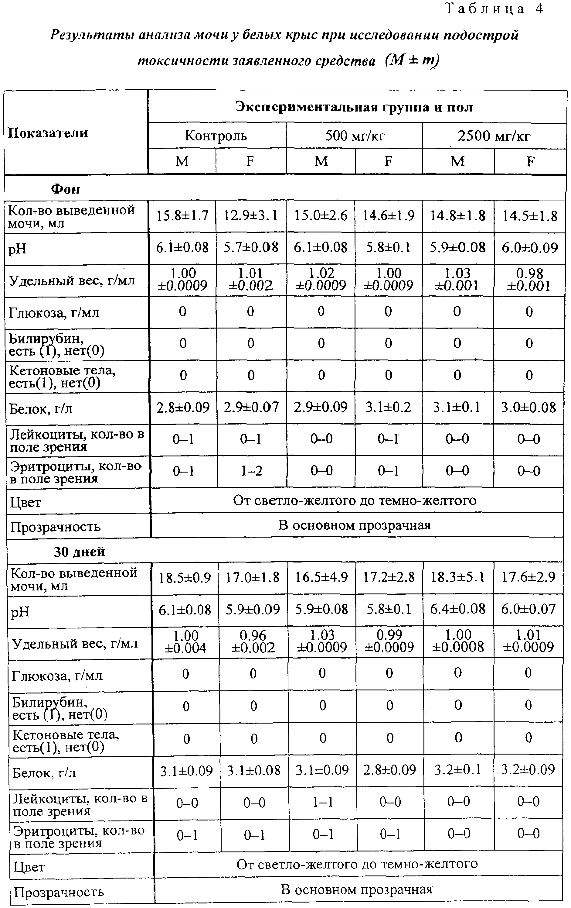 Полученные данные свидетельствуют об отсутствии достоверных изменений продолжительности гексеналового сна во всех экспериментальных группах после 30-дневной аппликации препарата. Влияние на функциональное состояние почек. Анализы мочи и оценка функциональной активности почек по секреции фенол-красного проведены в фоне и на 30-й день, в конце эксперимента. Полученные данные представлены в таблицах 4-6. Как можно видеть, показатели мочи во всех экспериментальных группах близки, достоверных отличий между какими-либо группами не выявляются.