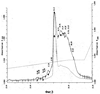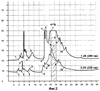 На фиг.2 представлена вторая стадия очистки – хроматограмма II фракции ОФ ВЭЖХ на колонке C18, Nova Pak. Waters, хроматограф Du Pont 8800, США, с детекторами: UV-спектрофотометр, 280 нм (Du Pont, США) и Uvicord SII, 226 нм (Farmacia LKB, Швеция); в градиенте (40 мин): буфер А – 0,1%-ный раствор трифторуксусной кислоты (ТФУ), буфер Б – 80% ацетонитрила в буфере А.